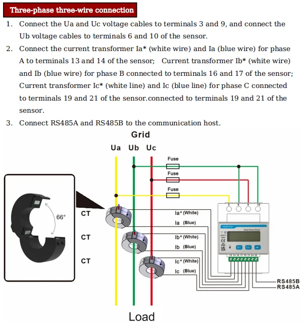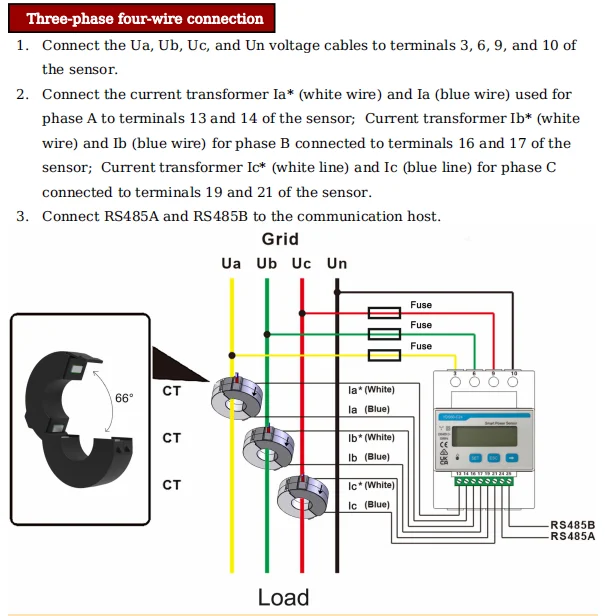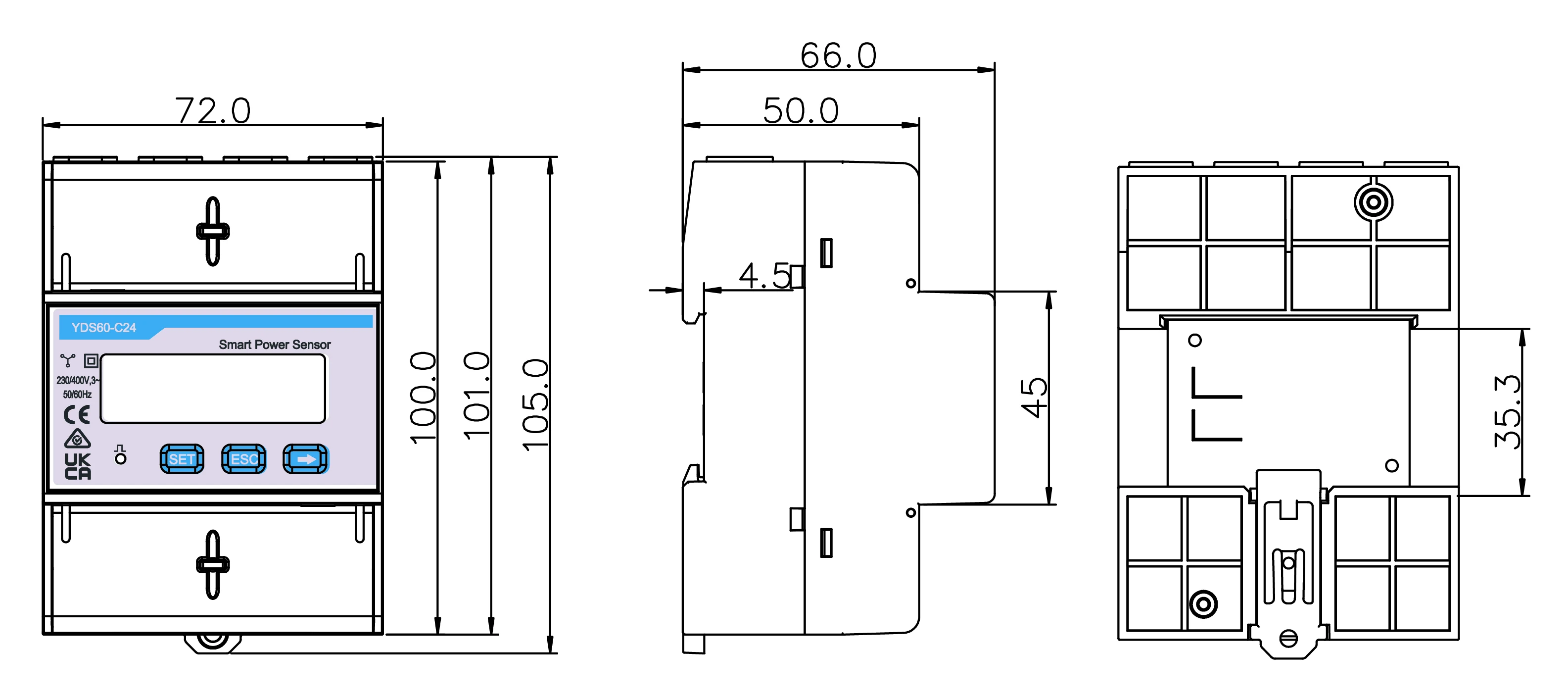 Specially Designed for Huawei PV Inverters – Compatible with Huawei solar energy systems, providing accurate monitoring and seamless integration. High Precision Measurement – Class 1 accuracy with current range up to 250A, ensuring reliable power data for industrial and solar applications. External CT 250A/50mA Included – Enables flexible installation and safe current measurement without disconnecting the main circuit. RS485 Communication (MODBUS-RTU) – Supports remote data reading and integration with smart energy management systems. Wide Application Range – Suitable for industrial, IoT, telecommunication, and household power monitoring. Easy DIN-Rail Installation – Compact 72×105×66mm housing for fast mounting in control panels. LCD Digital Display – Real-time voltage, current, and energy information with clear visibility. CE, UKCA, and RCM Certified – Meets international safety and performance standards for global markets. Durable andEco-Friendly Design – Operating temperature from -25℃ to 60℃ with long service life.